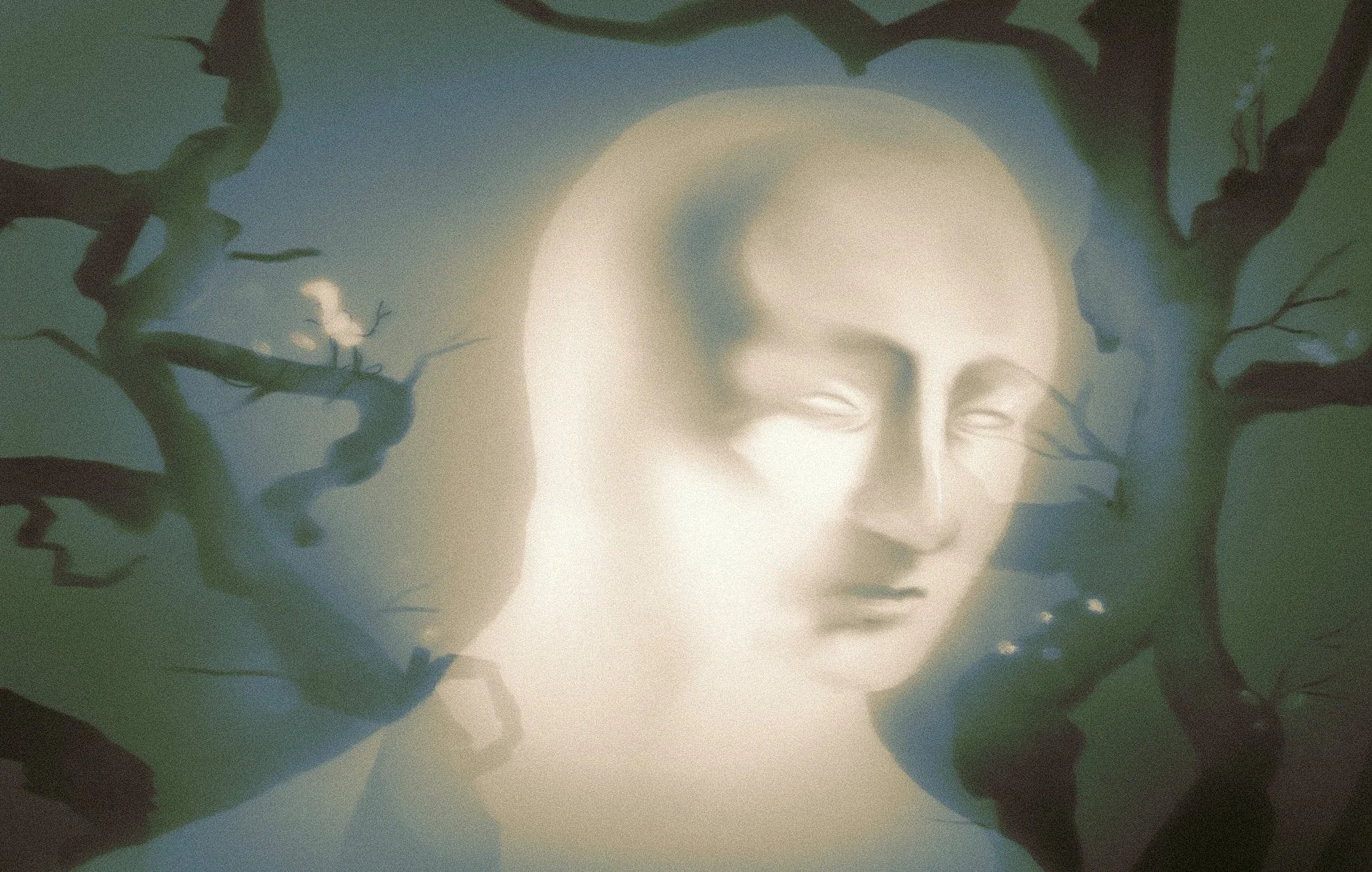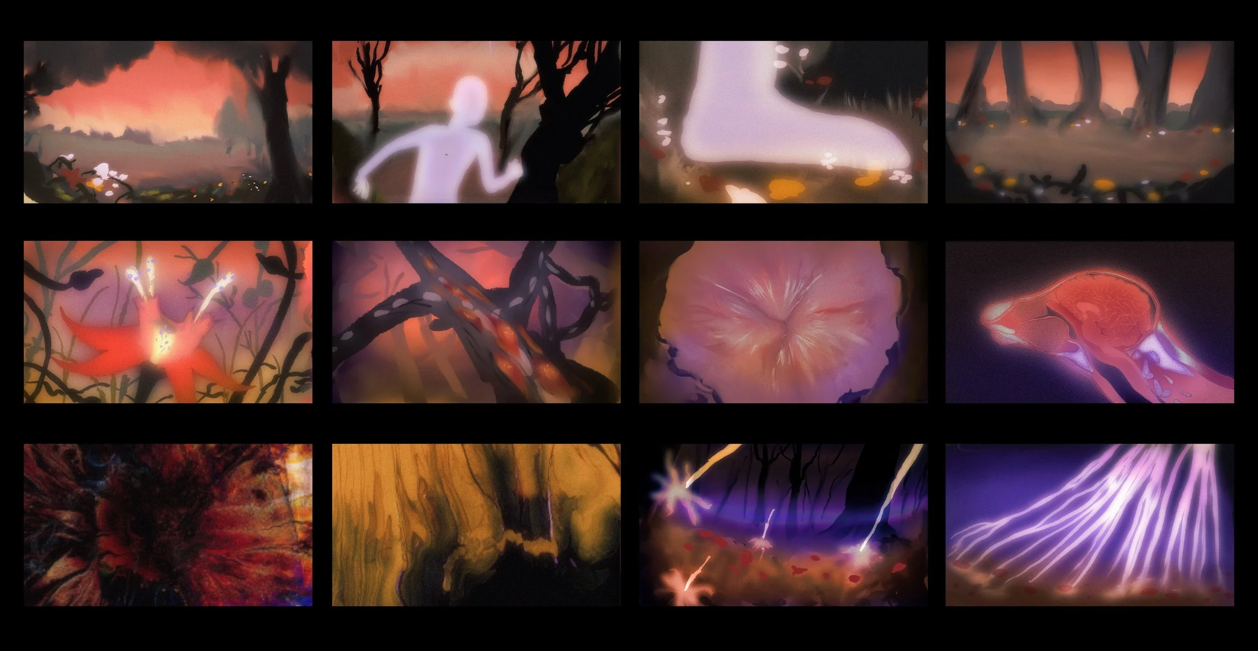 In a forest in constant flux, a humanoid creature absorbs everything around it until it fully merges with this ever-changing reality.